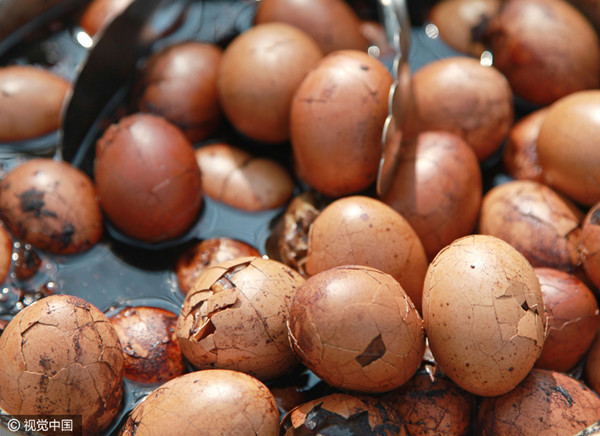 Los huevos de té son deliciosos como aperitivo o para el desayuno, en el que se le quita la cascara a un huevo duro y se hierve de nuevo en el té, salsa y especias. [Foto / VCG]