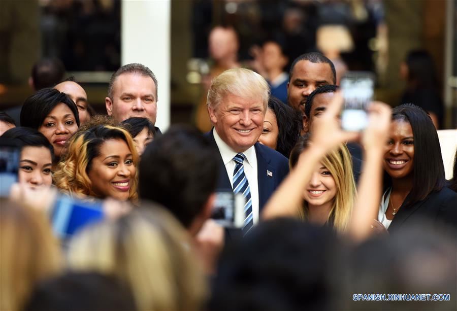 El candidato presidencial estadounidense, Donald Trump (c), del partido Republicano, posa durante la ceremonia de inauguración y corte de listón del Trump International Hotel, en Washington, D.C., capital de Estados Unidos de América, el 26 de octubre de 2016. (Xinhua/Yin Bogu)