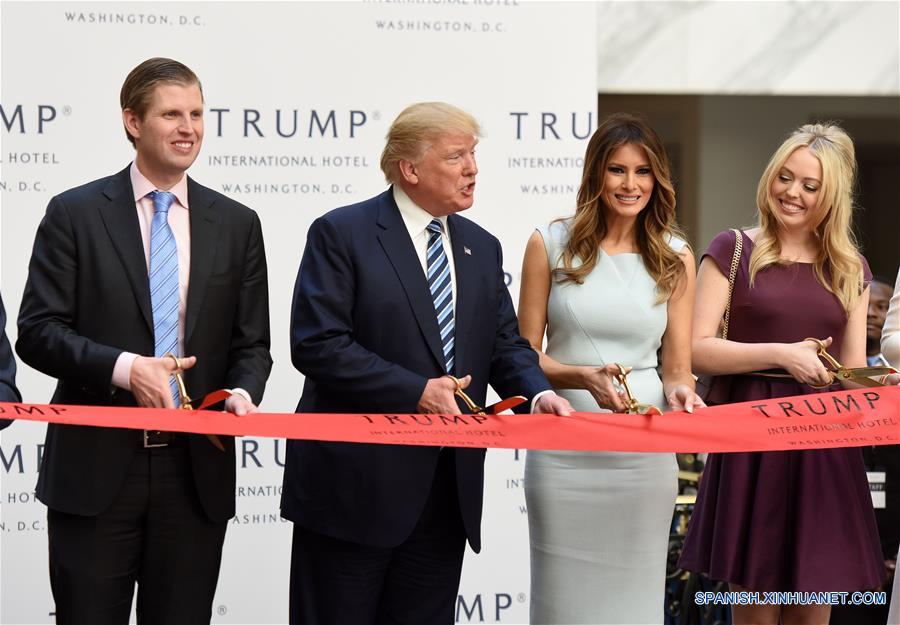 El candidato presidencial estadounidense, Donald Trump (2-i), del partido Republicano, y los miembros de su familia cortan el listón durante la ceremonia de inauguración y corte de listón del Trump International Hotel, en Washington, D.C., capital de Estados Unidos de América, el 26 de octubre de 2016. La ceremonia de inaguración y corte de listón del Trump International Hotel se llevó a cabo el miércoles. (Xinhua/Yin Bogu)