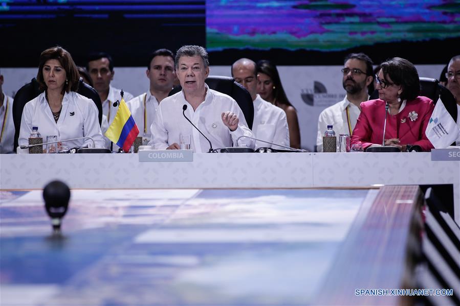El presidente de Colombia, Juan Manuel Santos (c), pronuncia un discurso durante la Instalación de la XXV Cumbre Iberoamericana de Jefes de Estado y de Gobierno, en Cartagena de Indias, Colombia, el 29 de octubre de 2016. El presidente de Colombia, Juan Manuel Santos, inauguró el sábado oficialmente la XXV Cumbre Iberoamericana de Jefes de Estado y de Gobierno en Cartagena de Indias, Colombia, en la cual los temas propuestos por el anfitrión fueron Juventud, Emprendimiento y Educación. (Xinhua/Jhon Paz)