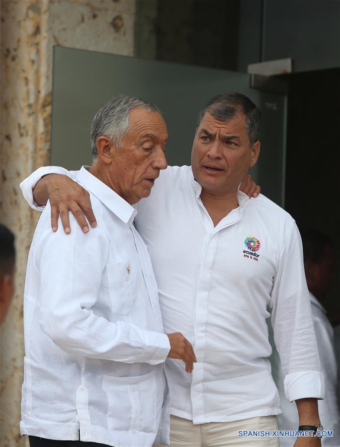 El presidente de Ecuador, Rafael Correa (d), conversa con el presidente de Portugal, Marcelo Rebelo de Sousa (i), mientras asisten a la toma de la fotografía oficial de la XXV Cumbre Iberoamericana de Jefes de Estado y de Gobierno, en Cartagena de Indias, Colombia, el 29 de octubre de 2016. El presidente de Colombia, Juan Manuel Santos, inauguró el sábado oficialmente la XXV Cumbre Iberoamericana de Jefes de Estado y de Gobierno en Cartagena de Indias, Colombia, en la cual los temas propuestos por el anfitrión fueron Juventud, Emprendimiento y Educación. (Xinhua/Mauricio Collado)
