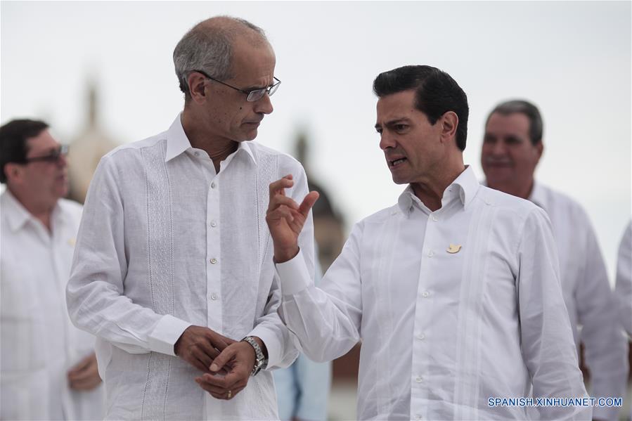 El presidente de México, Enrique Pe?a Nieto (d), conversa con el presidente del Gobierno de Andorra, Antoni Martí (i), previo a la toma de la fotografía oficial de la XXV Cumbre Iberoamericana de Jefes de Estado y de Gobierno, en Cartagena de Indias, Colombia, el 29 de octubre de 2016. El presidente de Colombia, Juan Manuel Santos, inauguró el sábado oficialmente la XXV Cumbre Iberoamericana de Jefes de Estado y de Gobierno en Cartagena de Indias, Colombia, en la cual los temas propuestos por el anfitrión fueron Juventud, Emprendimiento y Educación. (Xinhua/Jhon Paz)