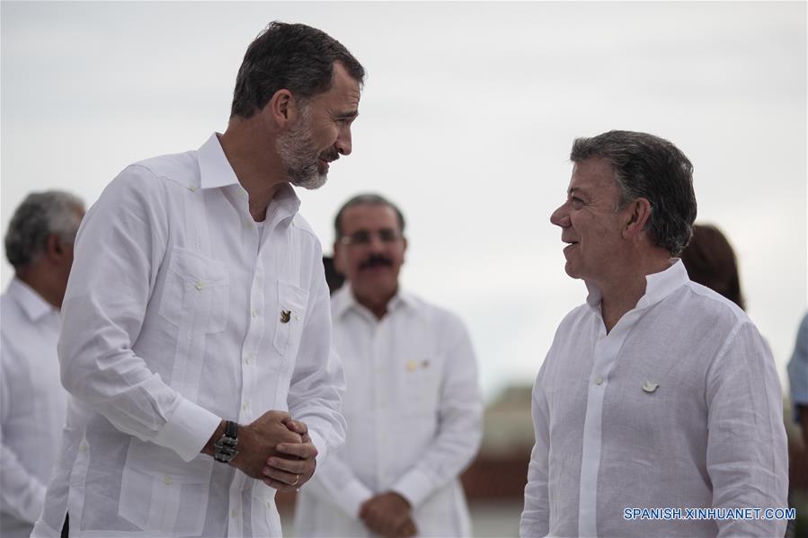 El presidente de Colombia, Juan Manuel Santos (d), conversa con el rey de Espa?a, Don Felipe VI (i), previo a la toma de la fotografía oficial de la XXV Cumbre Iberoamericana de Jefes de Estado y de Gobierno, en Cartagena de Indias, Colombia, el 29 de octubre de 2016. El presidente de Colombia, Juan Manuel Santos, inauguró el sábado oficialmente la XXV Cumbre Iberoamericana de Jefes de Estado y de Gobierno en Cartagena de Indias, Colombia, en la cual los temas propuestos por el anfitrión fueron Juventud, Emprendimiento y Educación. (Xinhua/Jhon Paz)