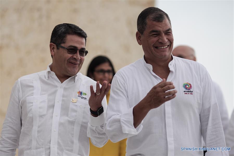 El presidente de Honduras, Juan Orlando Hernández (i), conversa con presidente de Ecuador, Rafael Correa (d), previo a la toma de la fotografía oficial de la XXV Cumbre Iberoamericana de Jefes de Estado y de Gobierno, en Cartagena de Indias, Colombia, el 29 de octubre de 2016. El presidente de Colombia, Juan Manuel Santos, inauguró el sábado oficialmente la XXV Cumbre Iberoamericana de Jefes de Estado y de Gobierno en Cartagena de Indias, Colombia, en la cual los temas propuestos por el anfitrión fueron Juventud, Emprendimiento y Educación. (Xinhua/Jhon Paz)