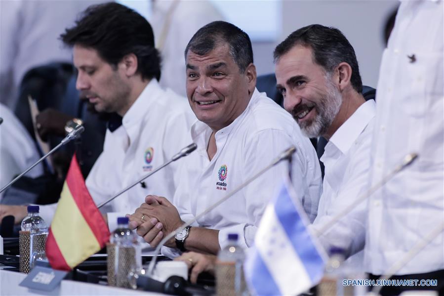 El rey de Espa?a, Don Felipe VI (d), y el presidente de Ecuador, Rafael Correa (c), reaccionan previo a la Instalación de la XXV Cumbre Iberoamericana de Jefes de Estado y de Gobierno, en Cartagena de Indias, Colombia, el 29 de octubre de 2016. El presidente de Colombia, Juan Manuel Santos, inauguró el sábado oficialmente la XXV Cumbre Iberoamericana de Jefes de Estado y de Gobierno en Cartagena de Indias, Colombia, en la cual los temas propuestos por el anfitrión fueron Juventud, Emprendimiento y Educación. (Xinhua/Jhon Paz)