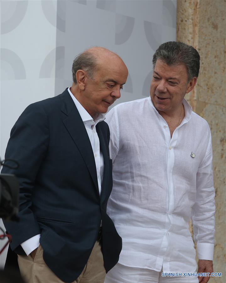 El presidente de Colombia, Juan Manuel Santos (d), conversa con el ministro de Relaciones Exteriores de Brasil, José Serra (i), mientras asisten a la toma de la fotografía oficial de la XXV Cumbre Iberoamericana de Jefes de Estado y de Gobierno, en Cartagena de Indias, Colombia, el 29 de octubre de 2016. El presidente de Colombia, Juan Manuel Santos, inauguró el sábado oficialmente la XXV Cumbre Iberoamericana de Jefes de Estado y de Gobierno en Cartagena de Indias, Colombia, en la cual los temas propuestos por el anfitrión fueron Juventud, Emprendimiento y Educación. (Xinhua/Mauricio Collado)