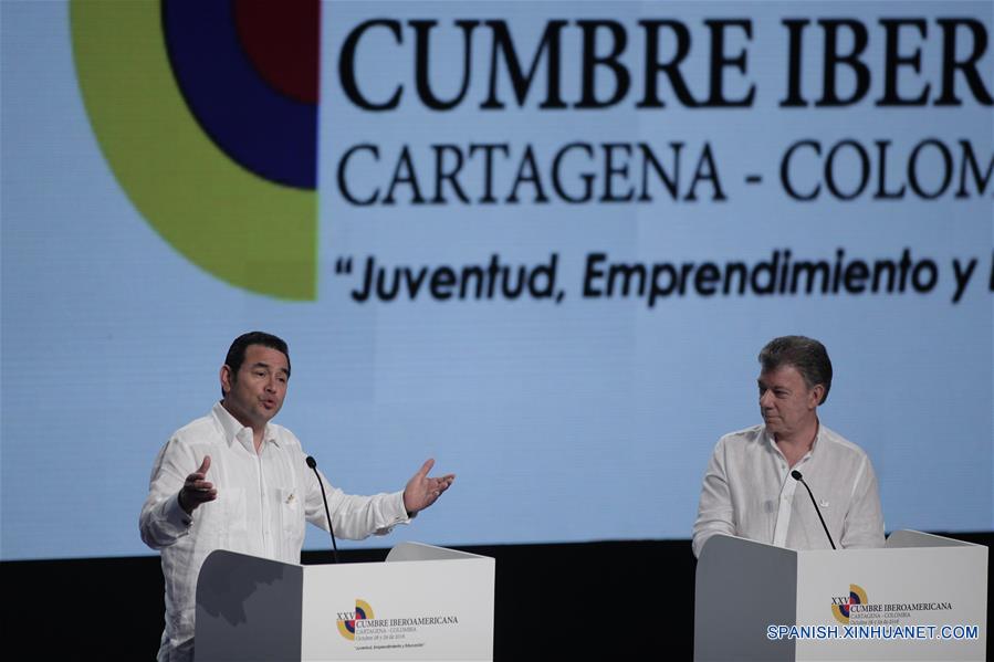 El presidente de Colombia, Juan Manuel Santos, pronuncia un discurso durante una declaración a medios después de la clausura de la XXV Cumbre Iberoamericana de Jefes de Estado y de Gobierno en Cartagena de Indias, Colombia, el 29 de octubre de 2016. El presidente de Colombia, Juan Manuel Santos, inauguró el sábado oficialmente la XXV Cumbre Iberoamericana de Jefes de Estado y de Gobierno en Cartagena de Indias, Colombia, en la cual los temas propuestos por el anfitrión fueron Juventud, Emprendimiento y Educación. (Xinhua/Jhon Paz)