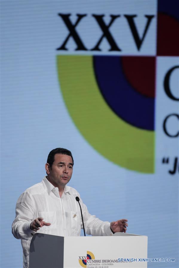 El presidente de Guatemala, Jimmy Morales, pronuncia un discurso durante una declaración a medios después de la clausura de la XXV Cumbre Iberoamericana de Jefes de Estado y de Gobierno en Cartagena de Indias, Colombia, el 29 de octubre de 2016. El presidente de Colombia, Juan Manuel Santos, inauguró el sábado oficialmente la XXV Cumbre Iberoamericana de Jefes de Estado y de Gobierno en Cartagena de Indias, Colombia, en la cual los temas propuestos por el anfitrión fueron Juventud, Emprendimiento y Educación. (Xinhua/Jhon Paz)