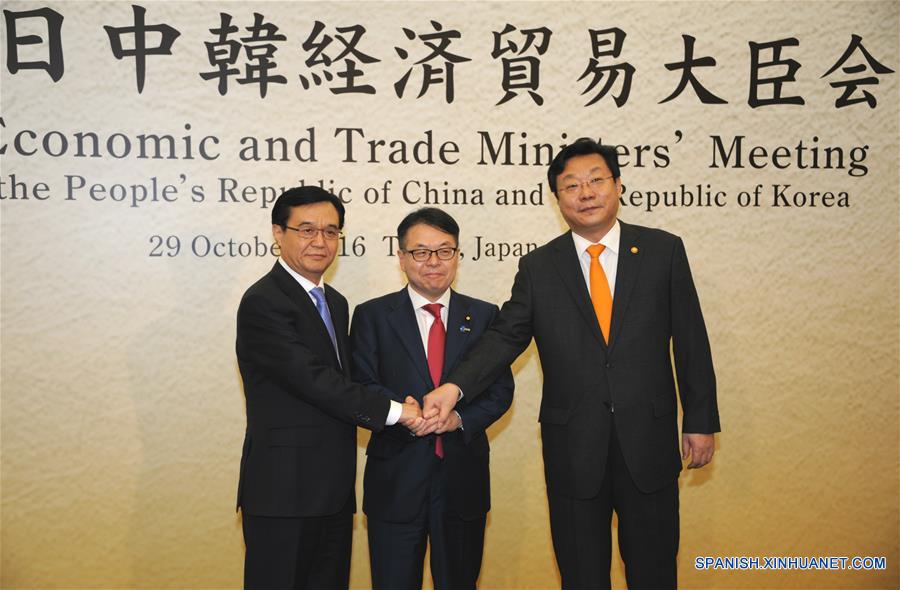 El ministro de Comercio de China, Gao Hucheng (i), el ministro de Economía, Comercio e Industria de Japón, Hiroshige Seko (c), y el ministro de Comercio, Industria y Energía de República de Corea, Joo Hyung Hwan (d), posan previo a participar en la 11 Reunión de Ministros de Economía y Comercio entre China, Japón y República de Corea, en Tokio, Japón, el 29 de octubre de 2016. Los ministros de comercio de China, Japón y República de Corea acordaron el sábado fortalecer la cooperación económica y comercial entre los tres vecinos. (Xinhua/Hua Yi)