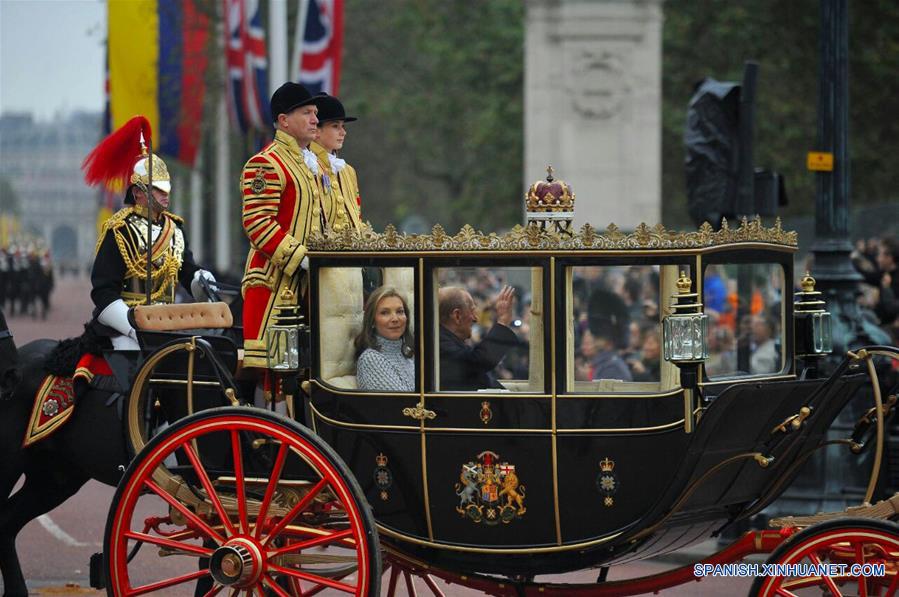 La primera dama de Colombia, María Clemencia Rodríguez (2-d), viaja en un carruaje con el príncipe Felipe (d), duque de Edimburgo, durante el recibimiento de la reina Isabel II, de Reino Unido, al presidente de Colombia, Juan Manuel Santos, en el Palacio de Buckingham en Londres, Reino Unido, el 1 de noviembre de 2016. El presidente colombiano, Juan Manuel Santos, fue recibido por la reina Isabel II, de Reino Unido, y el príncipe Felipe, duque de Edimburgo, el martes en el Palacio de Buckingham. Santos también se reuniría con la primera ministra británica, Theresa May, con los líderes del Parlamento, con el alcalde de Londres, Sadiq Khan, y con empresarios, como parte de su primera visita de Estado a Reino Unido como huésped oficial de la reina Isabel II, de acuerdo con información de la prensa local. (Xinhua/COLPRENSA)