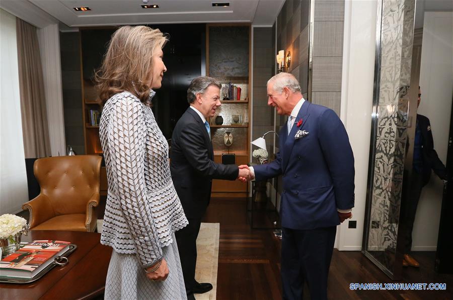 Imagen cedida por la Presidencia de Colombia del principe Carlos (d), de Gales, recibiendo al presidente de Colombia, Juan Manuel Santos (c), y su esposa, la primera dama de Colombia, María Clemencia Rodríguez (i), en su residencia de Clarence House en Londres, Reino Unido, el 1 de noviembre de 2016. El presidente colombiano, Juan Manuel Santos, fue recibido por la reina Isabel II, de Reino Unido, y el príncipe Felipe, duque de Edimburgo, el martes en el Palacio de Buckingham. Santos también se reuniría con la primera ministra británica, Theresa May, con los líderes del Parlamento, con el alcalde de Londres, Sadiq Khan, y con empresarios, como parte de su primera visita de Estado a Reino Unido como huésped oficial de la reina Isabel II, de acuerdo con información de la prensa local. (Xinhua/Juan Tena/Presidencia de Colombia)