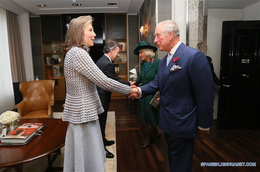 Imagen cedida por la Presidencia de Colombia del príncipe Carlos (d) de Gales, y su esposa Camila (2-d), duquesa de Cornualles, recibiendo al presidente de Colombia, Juan Manuel Santos (2-i), y su esposa, la primera dama de Colombia, María Clemencia Rodríguez (i), en su residencia de Clarence House en Londres, Reino Unido, el 1 de noviembre de 2016. El presidente colombiano, Juan Manuel Santos, fue recibido por la reina Isabel II, de Reino Unido, y el príncipe Felipe, duque de Edimburgo, el martes en el Palacio de Buckingham. Santos también se reuniría con la primera ministra británica, Theresa May, con los líderes del Parlamento, con el alcalde de Londres, Sadiq Khan, y con empresarios, como parte de su primera visita de Estado a Reino Unido como huésped oficial de la reina Isabel II, de acuerdo con información de la prensa local. (Xinhua/Mónica González/Presidencia de Colombia)