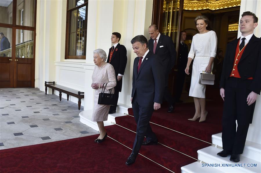 Imagen cedida por la Presidencia de Colombia de la reina Isabel II (i), de Reino Unido, y el príncipe Felipe (2-i-atrás), duque de Edimburgo, despidiendo al presidente colombiano, Juan Manuel Santos (2-i), y su esposa, la primera dama colombiana, María Clemencia Rodríguez (2-d), en el Palacio de Buckingham en Londres, Reino Unido, el 3 de noviembre de 2016. El presidente colombiano, Juan Manuel Santos, y su esposa María Clemencia Rodríguez, fueron despedidos el jueves por la reina Isabel II y el príncipe Felipe duque de Edimburgo, en el Palacio de Buckingham en Londres al terminar su primera visita de Estado a Reino Unido. El presidente Santos posteriormente se dirigió a Belfast en Irlanda del Norte, de acuerdo con información de la prensa local. (Xinhua/César Carrión/Presidencia de Colombia)