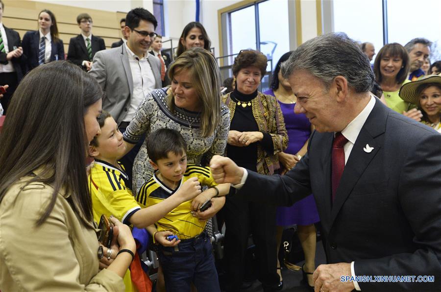 BELFAST, noviembre 3, 2016 (Xinhua) -- Imagen cedida por la Presidencia de Colombia del presidente colombiano, Juan Manuel Santos (d), interactuando durante una reunión con la comunidad colombiana residente en la ciudad de Belfast, Irlanda del Norte, Reino Unido, el 3 de noviembre de 2016.