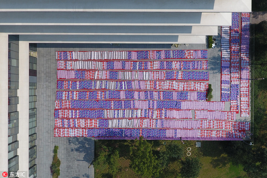 Tres mil edredones se orean en la sede de Alibaba en Hangzhou, provincia de Zhejiang, 3 de noviembre del 2016. [Foto: IC]