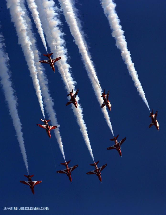 ZHUHAI, noviembre 3, 2016 (Xinhua) -- Red Arrows, equipo acrobático de la Real Fuerza Aérea británica participan en la XI Exhibición Internacional de Aviación y Aeroespacial de China, en Zhuhai, provincia de Guangdong, en el sur de China, el 2 de noviembre de 2016. (Xinhua/Cai Yang)