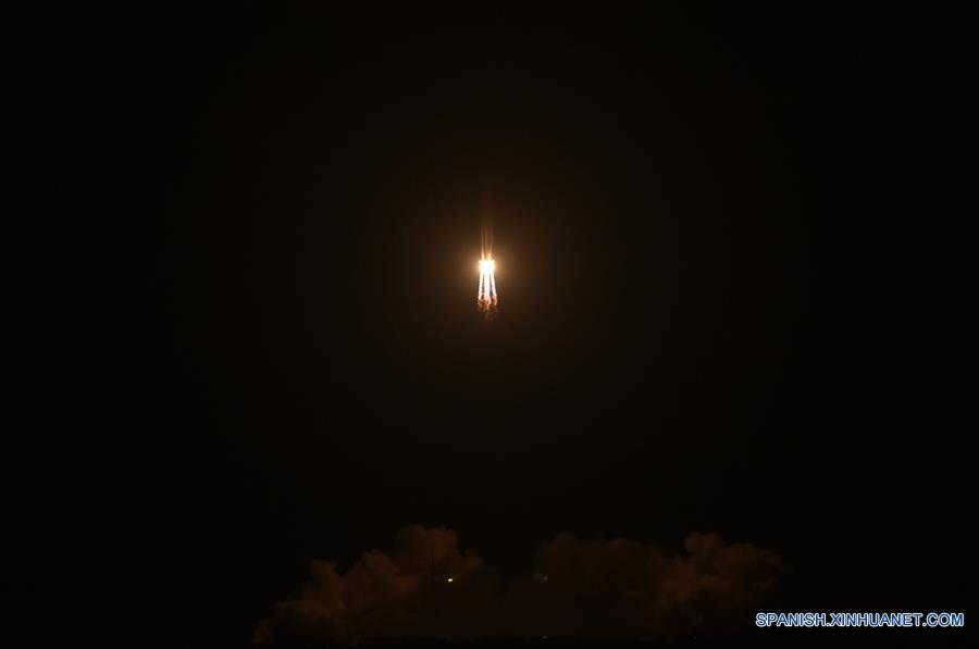 El cohete portador de carga pesada recién desarrollado de China, Gran Marcha-5, despega del Centro de Lanzamiento Espacial de Wenchang, en la provincia de Hainan, en el sur de China, el 3 de noviembre de 2016. El lanzamiento de China el jueves de su cohete portador de carga pesada recién desarrollado, el Gran Marcha-5, desde el Centro de Lanzamiento Espacial Wenchang costero en la provincia de Hainan, sur del país, fue todo un éxito. El cohete despegó alrededor de las 20:43 hora de Beijing. Un funcionario de la misión declaró el éxito del lanzamiento 40 minutos después. (Xinhua/Zhao Yingquan)