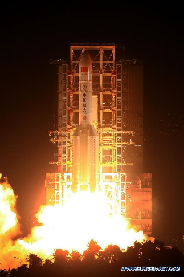El cohete portador de carga pesada recién desarrollado de China, Gran Marcha-5, despega del Centro de Lanzamiento Espacial de Wenchang, en la provincia de Hainan, en el sur de China, el 3 de noviembre de 2016. El lanzamiento de China el jueves de su cohete portador de carga pesada recién desarrollado, el Gran Marcha-5, desde el Centro de Lanzamiento Espacial Wenchang costero en la provincia de Hainan, sur del país, fue todo un éxito. El cohete despegó alrededor de las 20:43 hora de Beijing. Un funcionario de la misión declaró el éxito del lanzamiento 40 minutos después. (Xinhua/Li Gang)