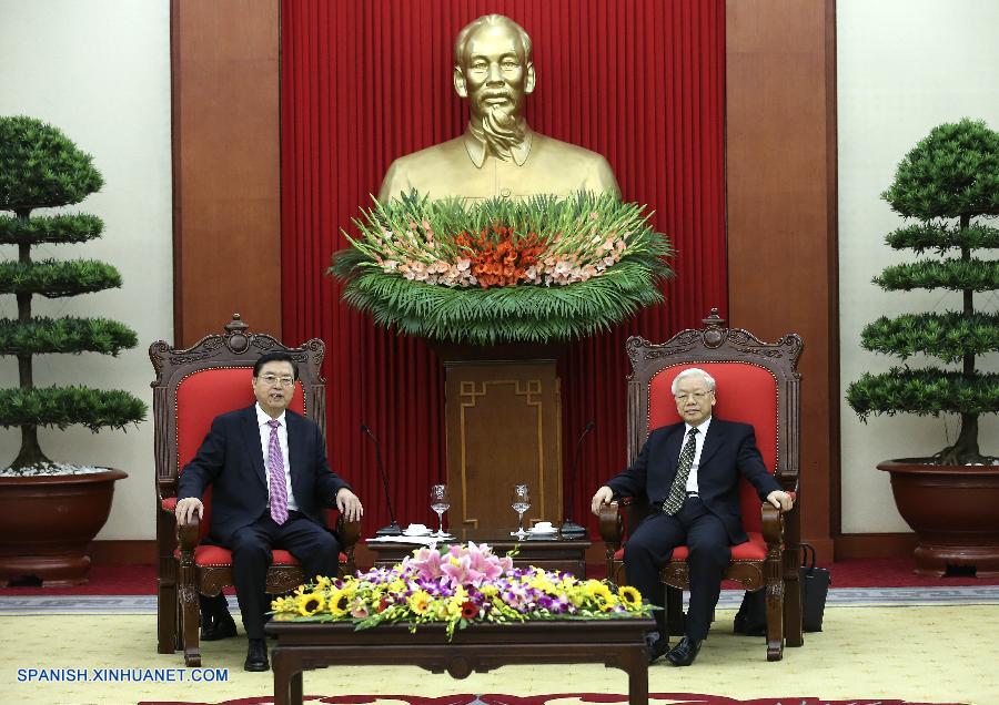 Zhang transmitió a Trong los saludos del secretario general del Comité Central del PCCh, Xi Jinping. Zhang elogió los logros alcanzados por el PCV y el Estado de Vietnam en a?os recientes.