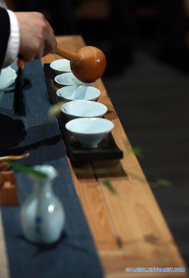 Un maestro del té presenta la ceremonia del té durante la inauguración de la Casa China de Té en Frankfurt, Alemania, el 12 de noviembre de 2016. (Xinhua/Luo Huanhuan)