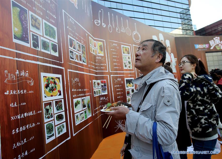 Personas observan los menús de los participantes de un concurso de cocina de un festival cultural ciudadano, en Shanghai, en el este China, el 12 de noviembre de 2016. Alrededor de 100 ciudadanos participaron el sábado en el evento. (Xinhua/Liu Ying)