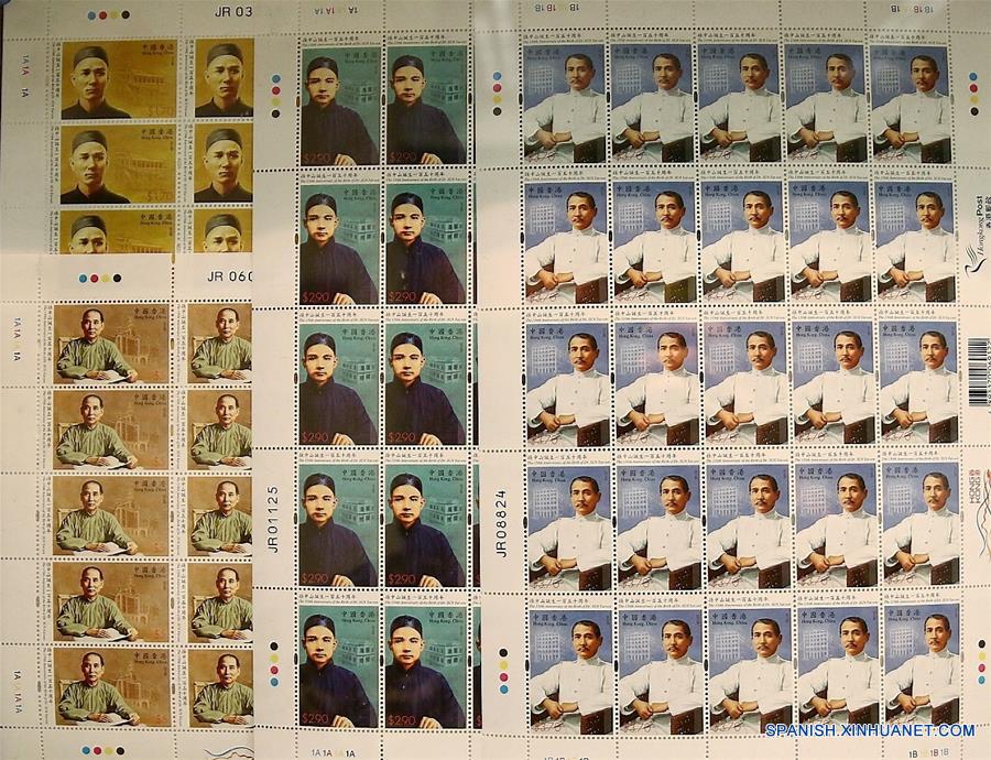 Vista de las estampillas conmemorativas por el 150 aniversario del nacimiento de Sun Yat-sen, en Hong Kong, en el sur China, el 12 de noviembre de 2016. El Correo de Hong Kong emitió el sábado una serie de estampillas conmemorativas por el 150 aniversario del nacimiento de Sun Yat-sen. (Xinhua/Wang Shen)