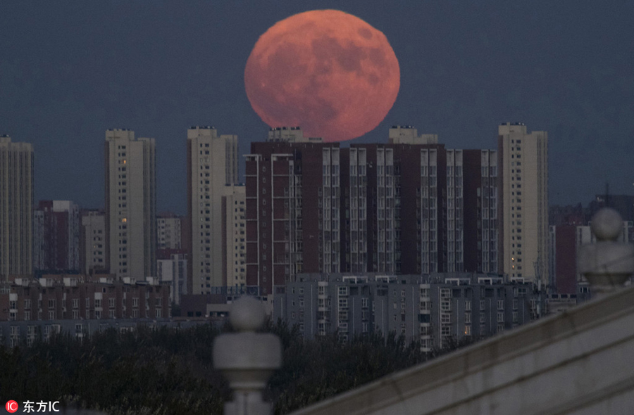La “superluna” sale por detrás de los edificios de apartamentos en Beijing, el 14 de noviembre de 2016. [Foto/IC]