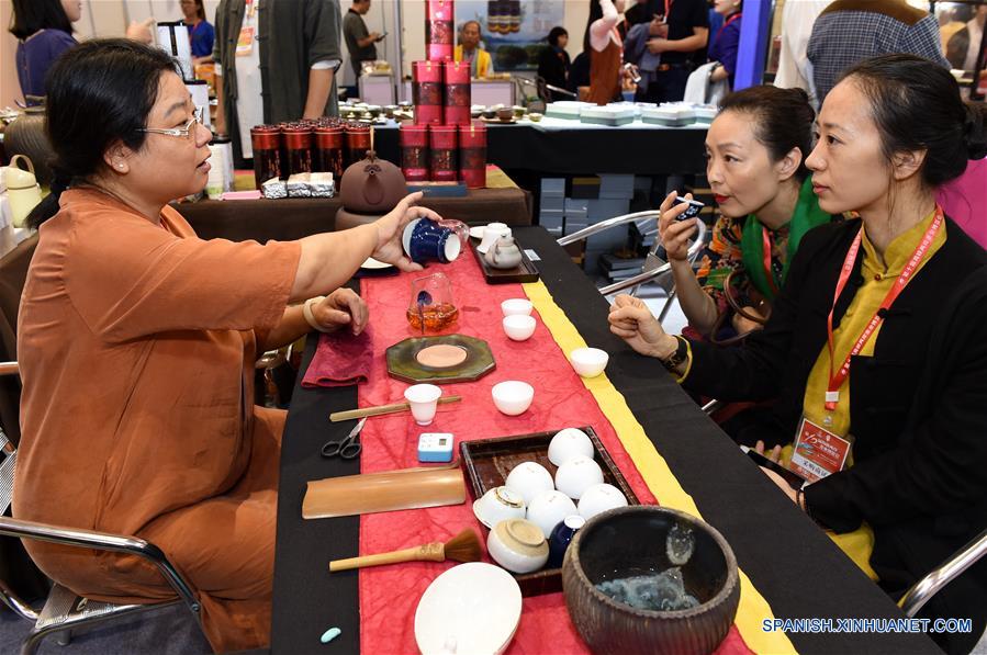 Una comerciante (i) de Taiwan, en el sureste de China, presenta su té durante la 10 Exposición del Té a Través del Estrecho, en Wuyishan, provincia de Fujian, en el suroeste de China, el 16 de noviembre de 2016. La exposición del té de tres días de duración comenzó el miércoles en Wuyishan. (Xinhua/Zhang Guojun)