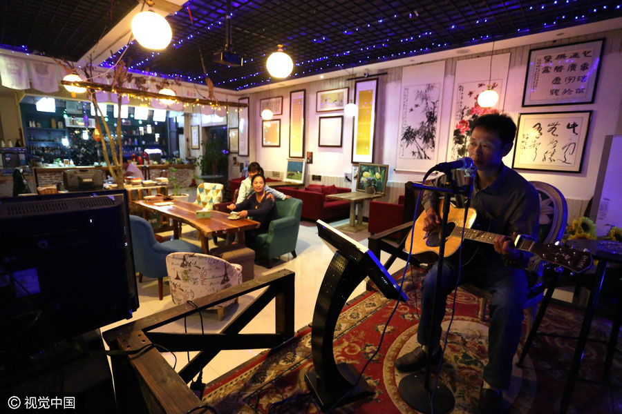 Xiaodong toca la guitarra para su esposa y su hija después de un largo día de trabajo en su cafetería en el condado Guzhen de Bengbu, provincia de Anhui, el 30 de octubre de 2016. [Foto / VCG]