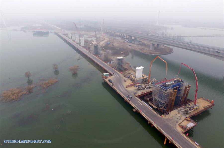 BEIJING, noviembre 18, 2016 (Xinhua) -- Vista aérea del muelle de concreto en el sitio de construcción del Puente del Embalse de Guanting del ferrocarril de alta velocidad Beijing-Zhangjiakou, el 18 de noviembre de 2016. La construcción del proyecto principal del puente está programada para ser finalizada en 2017. (Xinhua/Xing Guangli)