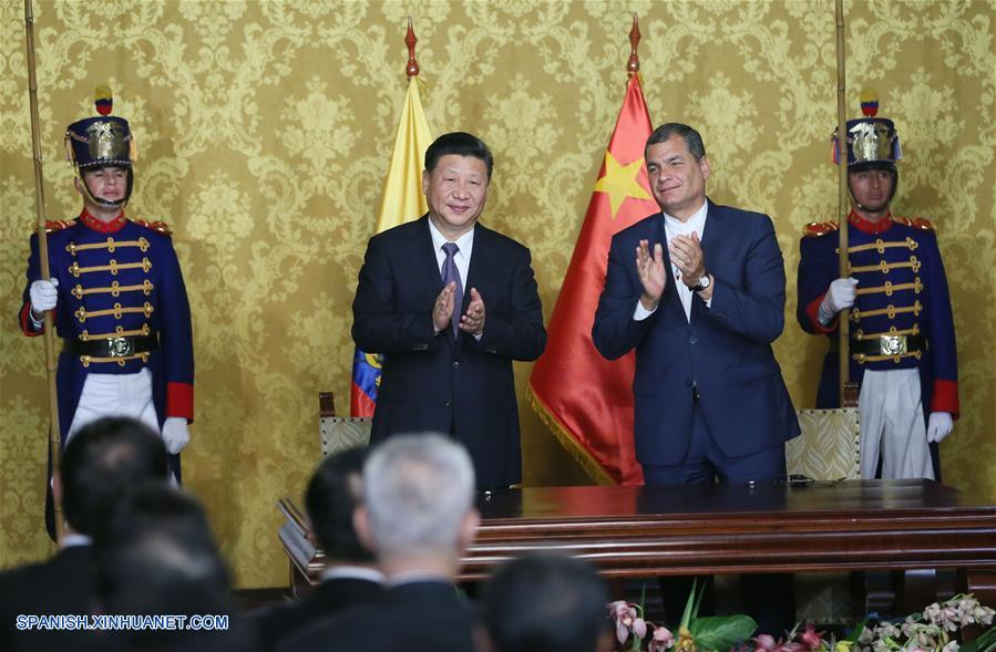 QUITO, noviembre 18, 2016 (Xinhua) -- El presidente de China, Xi Jinping, y el presidente de Ecuador, Rafael Correa, se reúnen con representantes de medios de comunicación después de sus conversaciones en Quito, Ecuador, el 17 de noviembre de 2016. (Xinhua/Lan Hongguang)