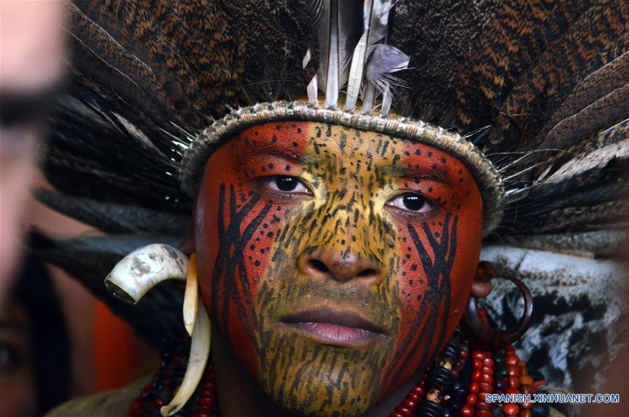 Un miembro de las comunidades indígenas participa durante una protesta contra la propuesta de enmienda constitucional PEC 215, frente al Palacio de Planalto, en Brasilia, capital de Brasil, el 22 de noviembre de 2016. Indígenas pertenecientes a diversas etnias acudieron a la entrada principal del Palacio de Planalto en demanda de más recursos para el Instituto Nacional de Colonización y Reforma Agraria (Incra), la Fundación Nacional del Indio (Funai) y el Secretario del Patrimonio de la Unión (SPU). Los manifestantes también de mandaron una mayor autonomía y protagonismo de las comunidades en los procesos de gestión y control de los territorios y áreas de preservación, de acuerdo con información de la prensa local. (Xinhua/Renato Costa/AGENCIA ESTADO)