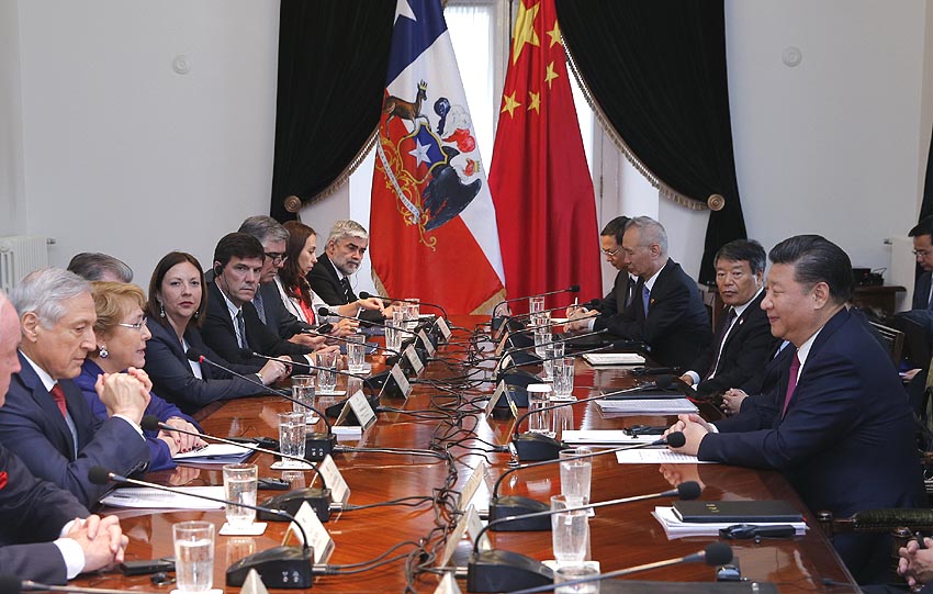 China y Chile acordaron elevar sus lazos bilaterales hasta el nivel de asociación estratégica integral durante la primera visita de Estado del presidente chino, Xi Jinping, a Chile desde que este asumiera su cargo en 2013. (Xinhua/Ju Peng)