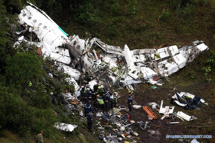 Rescatistas laboran en el sitio del accidente del avión que transportaba al equipo de fútbol brasile?o Chapecoense, en el municipio La Ceja, cerca de Medellín, en el departamento de Antioquía, Colombia, el 29 de noviembre de 2016. El accidente del avión en el que murieron al menos 75 personas y que trasladaba al equipo brasile?o Chapecoense, implica "un día trágico para el fútbol", afirmó el martes en la capital paraguaya el presidente de la Conmebol, Alejandro Domínguez. (Xinhua/Imago/ZUMAPRESS)