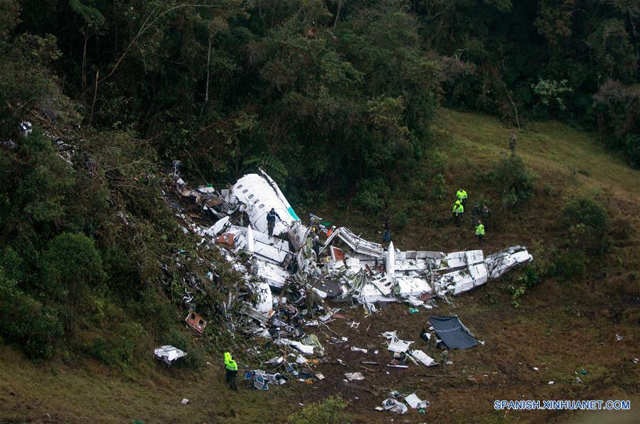 Elementos de seguridad inspeccionan el sitio del accidente del avión que transportaba al equipo de fútbol brasile?o Chapecoense, en el municipio La Ceja, cerca de Medellín, en el departamento de Antioquía, Colombia, el 29 de noviembre de 2016. El accidente del avión en el que murieron al menos 75 personas y que trasladaba al equipo brasile?o Chapecoense, implica "un día trágico para el fútbol", afirmó el martes en la capital paraguaya el presidente de la Conmebol, Alejandro Domínguez. (Xinhua/Imago/ZUMAPRESS)