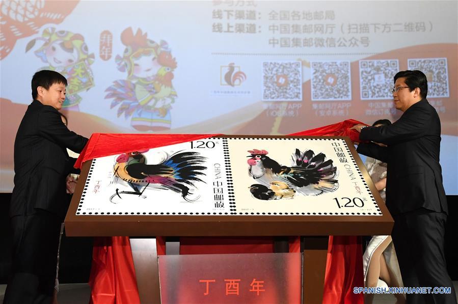 BEIJING, noviembre 30, 2016 (Xinhua) -- Los borradores oficiales de las estampillas para el A?o Dingyou, o el A?o del Gallo, son presentadas en Beijing, China, el 30 de noviembre de 2016. El Correo de China publicó oficialmente el miércoles el borrador de la estampilla especial del A?o Nuevo Lunar. (Xinhua/Li He)