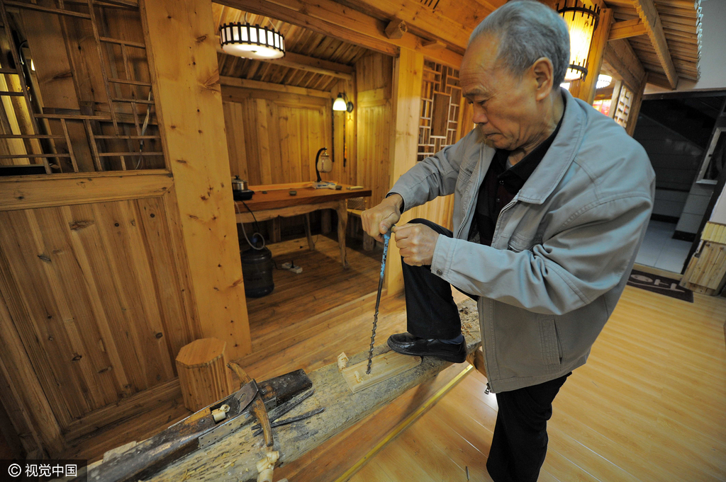 El veterano carpintero de 73 a?os llamado Peng Zhejun empleó seis horas al día para construir una casa de madera de treinta metros cuadrados al estilo antiguo chino y todos los muebles interiores.