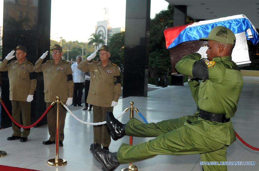 LA HABANA, noviembre 30, 2016 (Xinhua) -- Miembros de la Guardia de Honor trasladan las cenizas del líder cubano Fidel Castro en la sede del Ministerio de las Fuerzas Armadas Revolucionarias en la ciudad de La Habana, Cuba, el 30 de noviembre de 2016. El traslado de las cenizas del líder revolucionario cubano Fidel Castro comenzó el miércoles desde el Ministerio de las Fuerzas Armadas Revolucionarias hacia la ciudad oriental de Santiago de Cuba, donde reposarán de manera definitiva. A las 07:16 hora local se inició el recorrido del cortejo fúnebre con la urna de cedro cubierta por la bandera nacional cubana, que fue despedida por el pueblo congregado desde las primeras horas de la madrugada del miércoles a ambos lados de la avenida Paseo. (Xinhua/Vladimir Molina/PRENSA LATINA)