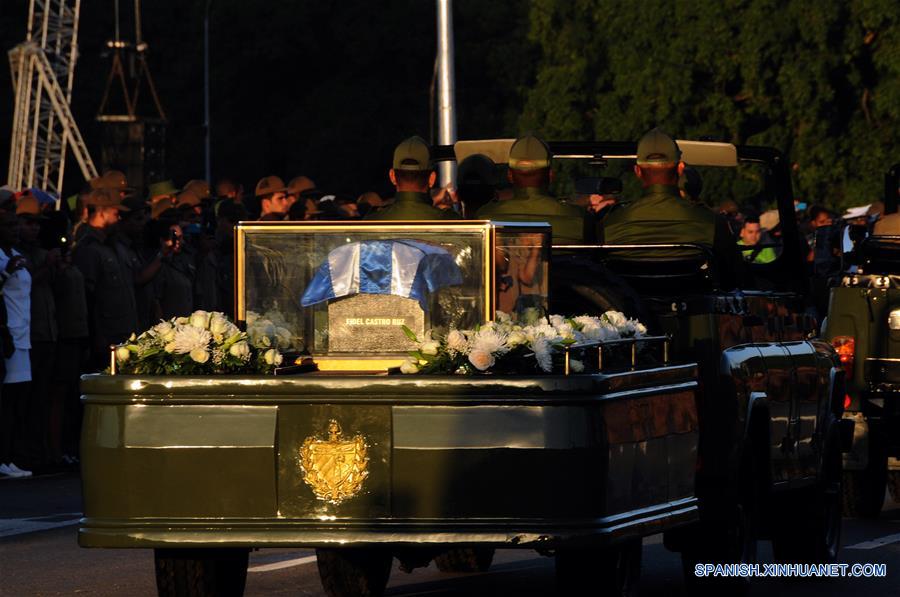 LA HABANA, noviembre 30, 2016 (Xinhua) -- Personas saludan a la caravana que transporta las cenizas del líder cubano Fidel Castro en la Plaza de la Revolución en la ciudad de La Habana, Cuba, el 30 de noviembre de 2016. El traslado de las cenizas del líder revolucionario cubano Fidel Castro comenzó el miércoles desde el Ministerio de las Fuerzas Armadas Revolucionarias hacia la ciudad oriental de Santiago de Cuba, donde reposarán de manera definitiva. A las 07:16 hora local se inició el recorrido del cortejo fúnebre con la urna de cedro cubierta por la bandera nacional cubana, que fue despedida por el pueblo congregado desde las primeras horas de la madrugada del miércoles a ambos lados de la avenida Paseo. (Xinhua/Emilio Herrera/PRENSA LATINA)