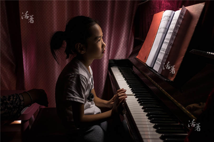 Duomi ensaya en el piano después de que regresa de patinar. Ella asiste a siete diferentes “cursos orientados": inglés, baile, patinaje, Olimpiadas de Matemáticas y pintura. [Foto: qq.com]