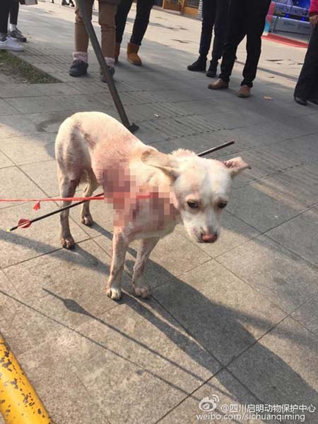 La flecha medía aproximadamente un metro de largo y no tenía punta. Casi todo el cuerpo de animal estaba manchado de sangre, según informó el Chongqing Morning Post. Un usuario de la red social dijo que no sabía si era un perro callejero, pero la herida parecía haber sido causada deliberadamente.