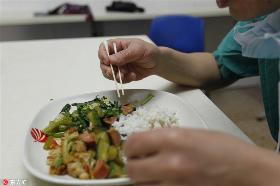 El cirujano Zhou Jianbo come con palitos de algodón en vez de usar palillos en el Hospital Popular de Hunan en la ciudad de Changsha para entrenar sus dedos y hacerlos más ágiles para las cirugías. El doctor Zhou es cirujano jefe adjunto del departamento de cirugía otorrinolaringológica, cabeza y cuello del hospital. Lleva más de dos a?os comiendo con palitos de algodón. A veces también come con la mano no dominante para darle más dificultad a la formación. [Foto/IC]