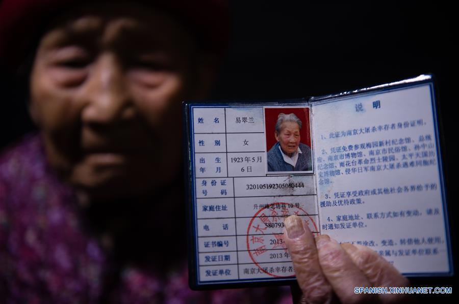 NANJING, diciembre 11, 2016 (Xinhua) -- Imagen del 25 de noviembre de 2016 de Yi Cuilan mostrando un certificado de sobreviviente de la Masacre de Nanjing. Yi Cuilan, nacida el 6 de mayo de 1923, sobrevivió a la invasión de las tropas japonesas al pretender ser un ni?o, buscando asilo en distintos campos de refugiados. A pesar de haber escapado a la muerte, sufre de dolores severos debido a un brutal ataque de los invasores japoneses. Las tropas japonesas ocuparon Nanjing, en el este de China, el 13 de diciembre de 1937, y comenzaron una masacre de seis semanas. Los registros chinos muestran que más de 300,000 personas, no sólo soldados desarmados sino también civiles, fueron brutalmente asesinadas y miles de mujeres fueron violadas. En los últimos 79 a?os, el número de sobrevivientes ha disminuido. Después de que Zhang Fuzhi, de 89 a?os, falleciera el 26 de noviembre de 2016, el número de sobrevivientes registrados se redujo a 108. Con heridas que no se pueden sanar, y el trágico recuerdo del sufrimiento, los sobrevivientes son los testigos de la masacre. (Xinhua/Li Xiang)