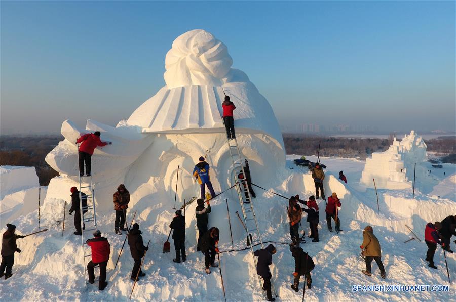 HEILONGJIANG, diciembre 14, 2016 (Xinhua) -- Trabajadores tallan una escultura de nieve en el Parque Internacional de Exposiciones de Escultura de Nieve Isla del Sol, en Harbin, capital de la provincia de Heilongjiang, en el noreste de China, el 14 de diciembre de 2016. La talla de un mu?eco de nieve de 34 metros de altura comenzó el martes en el parque en Harbin y se estima que será finalizada el 20 de diciembre. (Xinhua/Wang Jianwei)