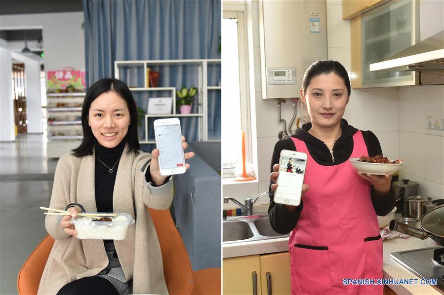 Oficinista o “dama de cuello blanco” Tong Lisha mostró su teléfono por el que había comprado su almuerzo. A la derecha, ama de casa Zhang Jing mostró su teléfono y el plato preparado por ella misma en la ciudad de Hangzhou, este de China. (Xinhua/Huang Zongzhi)