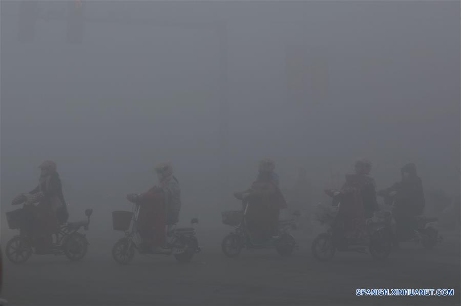 SHANDONG, diciembre 19, 2016 (Xinhua) -- Motociclistas circulan por una calle envuelta en esmog en el condado Caoxian de la provincia de Shandong, en el este de China, el 19 de diciembre de 2016. Esmog severo continuó cubriendo el norte de China y empeoró el lunes por la tarde, interrumpiendo la vida diaria en docenas de ciudades. (Xinhua/Dong Xide)