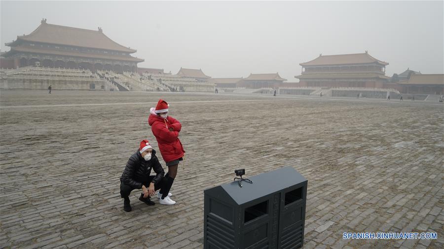 Turistas se toman fotografías en medio del esmog, en la Ciudad Prohibida en Beijing, capital de China, el 20 de diciembre de 2016. Un fuerte esmog permaneció en Beijing y muchas otras zonas del norte de China el miércoles, con más de 20 ciudades emitiendo una alerta roja por contaminación del aire. (Xinhua/Shen Bohan)
