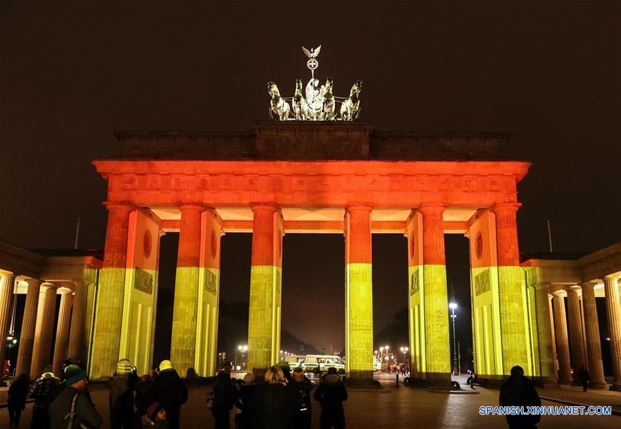 Personas permanecen frente a la Puerta de Brandeburgo, iluminada con los colores de la bandera nacional de Alemania en memoria de las víctimas de un ataque a un mercado de Navidad, en Berlín, capital de Alemania, el 20 de diciembre de 2016. Al menos 12 personas murieron y muchas otras resultaron heridas luego que un camión remolque cargara sobre una multitud en un mercado de Navidad el lunes por la noche en Berlín. (Xinhua/Shan Yuqi)