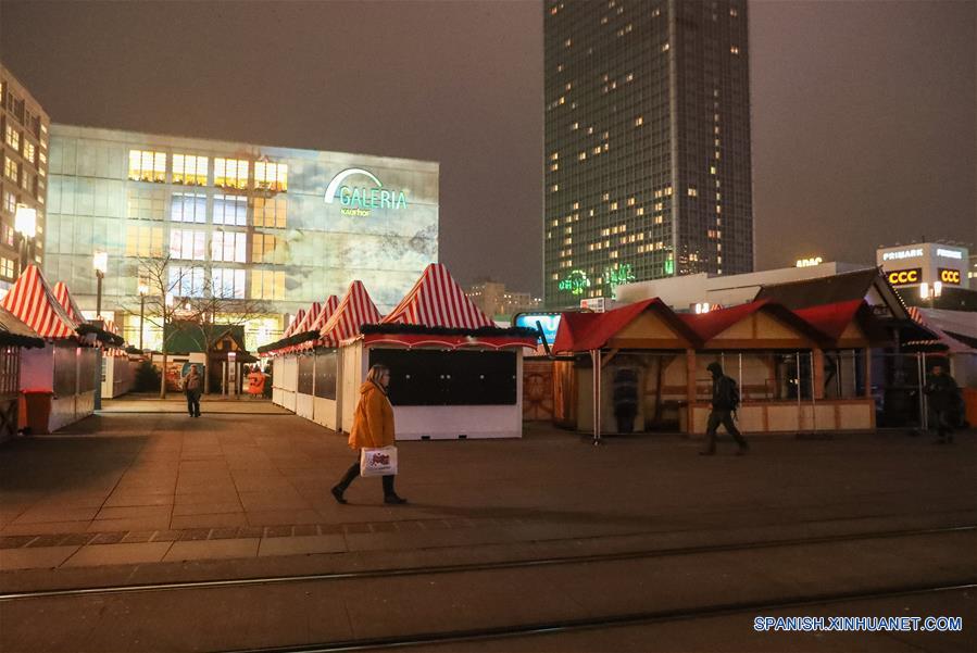 Personas caminan frente a un mercado navide?o que permanece cerrado en la Alexanderplatz en Berlín, capital de Alemania, el 20 de diciembre de 2016. Al menos 12 personas murieron y muchas otras resultaron heridas luego que un camión remolque cargara sobre una multitud en un mercado de Navidad el lunes por la noche en Berlín. (Xinhua/Shan Yuqi)