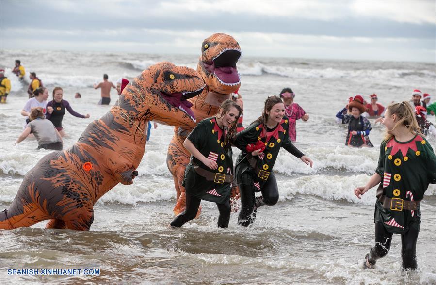DORSET, diciembre 25, 2016 (Xinhua) -- Residentes participan en el chapuzón navide?o para recaudar fondos para la organización de caridad "Royal National Lifeboat Institution" (RNLI), en Dorset, Reino Unido, el 25 de diciembre de 2016. (Xinhua/Mark Thomas/i-Images/ZUMAPRESS)